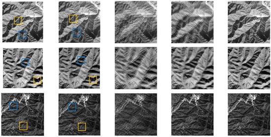 As shown in Figure 9, the box plots record the SSIM distributions of the compared methods for 467 pairs of mountainous remote sensing images in our testing dataset. It can be seen that the box size and space between the minimum and first quartile and between the third quartile and maximum for the proposed algorithm are the smallest. Moreover, the box location of the proposed algorithm is the highest as well, demonstrating the robustness and superiority of the proposed method.