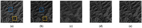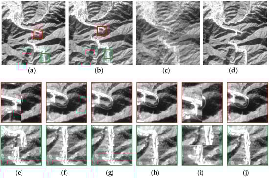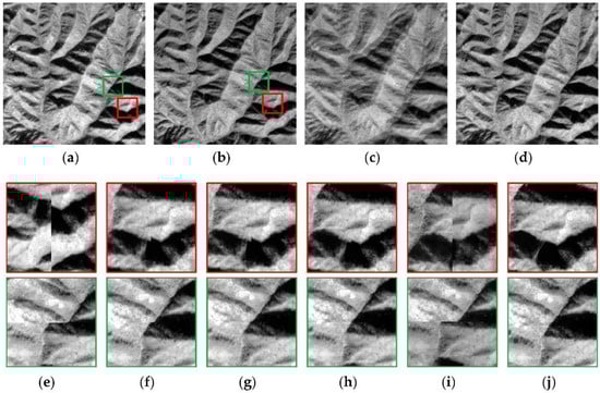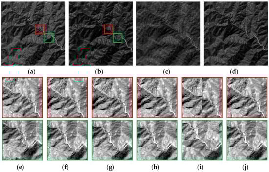 As presented in Section 4.2, the visual comparison can provide the observer with direct discovery in detail to ensure a quantitative evaluation for a comprehensive comparison. Therefore, four representative testing images with inconsistent surface structural features are selected, as shown in Figure 10, Figure 11, Figure 12 and Figure 13. The original reference and sensed images are listed in Figure 10a,b, Figure 11a,b, Figure 12a,b and Figure 13a,b, respectively. When overlapping, as shown in Figure 10c, Figure 11c, Figure 12c and Figure 13c, unsurprisingly there are distinct ghosts, and it can be seen that the image comes from two different ones. This is because the two images to be registered are not in the same coordinate system, and the same ground surface features have different spatial positions. Subsequently, when putting the focus on Figure 10d, Figure 11d, Figure 12d and Figure 13d, the overlapping images are the combination of the reference image and the aligned result from the proposed algorithm. The ridges and valleys are clear enough, and a few buildings are well defined also. Most importantly, the overlaid image looks like a single image rather than the superposition of two different ones.
