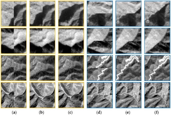 Enlargement of selected subimages via the reference and sensed (aligned) image mosaic: (a) the original images, (b) the ARM result, and (c) the proposed result used for vertical observations; (d) the original images, (e) the ARM result, (f) and the proposed result used for horizontal observations.