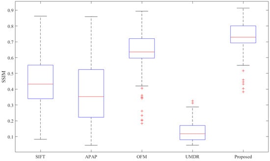 The above qualitative and quantitative analysis shows that the proposed registration strategy successively solves the mountainous remote sensing image registration problem. To further demonstrate the proposed algorithm, we compare it with four different approaches that are representative of conventional or deep-learning-based methods. The SSIM indicator is adopted as the accuracy metric, and the higher the SSIM, the better the registration performance. Furthermore, to verify the robustness of the proposed algorithm, we introduce the box plot to show the SSIM. The advantage of the box plot is that it can accurately and stably present the SSIM distribution without being affected by outliers, and is particularly useful for comparing distributions between several sets of data. The box plot is based on a five-number summary: the minimum, first quartile, median, third quartile, and maximum. The box size is decided by the region between the first and third quartiles of the SSIM distribution. If the box is too large, the SSIM distribution is discrete with fluctuation, and on the contrary the data are concentrated. On the other hand, the spaces between the minimum and first quartile and between the third quartile and maximum can also indicate the degree of dispersion in the data, i.e., the smaller the space, the more concentrated the data [65].