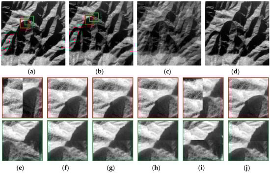 Visual comparisons of different registration methods used in test 4: (a) reference image; (b) sensed image; (c) overlap of the reference and the sensed images; (d) overlap of the reference and the proposed alignments. The enlarged subimages of (e) the original images, (f) SIFT, (g) APAP, (h) OFM, (i) UMDR, and (j) proposed image.