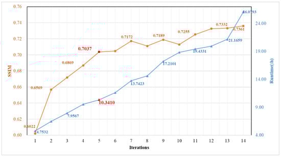 Allowing for the memory of our GPU, we set the iteration numbers from one to fourteen. It is worth noting that the experimental configuration and parameters of each iteration were the same, except for the number of iterations. As described in Section 4, the structural similarity evaluation indicator (SSIM) was employed to evaluate the registration results. Since the training stage is generally time-consuming, it plays an essential role in evaluating an algorithm’s efficiency. The running times for the network training phases with different numbers of iterations were counted, as shown in Figure 14.