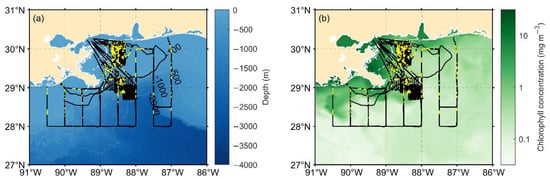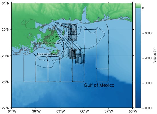 During late September and early October 2011, NOAA conducted flight surveys of zooplankton, phytoplankton and fish by airborne lidar in the northern Gulf of Mexico from 87°W to 90.5°W and 28°N to 30°N. The flight route is shown as the black line in Figure 1. The lidar was mounted on a KingAir 90 twin-engine aircraft with a nominal altitude of 300 m and a flight speed of 80–100 m/s []. NOAA Chemical Sciences Laboratory provided the raw LIDAR data.