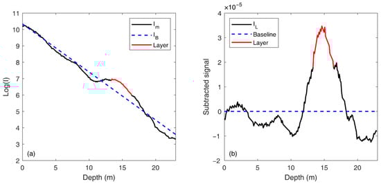 The processing of the lidar data is shown in Figure 2. In this example, one lidar echo signal is processed by fitting the photocathode current to obtain the background signal from 0 m to 22 m depth. The layer depth and thickness from this example are 14.6 m and 3.5 m, respectively. Since the perturbation method ignores the inhomogeneous scattering attenuation, this method will underestimate the layer signal, because the fitted background signal will be affected by the layer and slightly higher. However, the variation of the attenuation coefficient is relatively small, which will not have a substantial effect on the results.