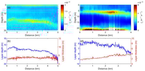 Vertical slices of volume backscattering coefficient and the corresponding thin layer depth and thickness expressed as the blue and red lines, respectively. (a) Vertical slice of on 24 September; (b) Corresponding layer depth and thickness on 24 September; (c) Vertical slice of on 4 October; (d) Corresponding layer depth and thickness on 4 October.
