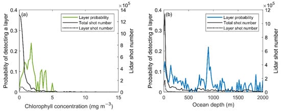 The relationship between the occurrence probability of thin phytoplankton layer and water depth was not significant. The detection was mainly concentrated in the area of water depth less than 500 m, and the probability was higher in this range. The penetration depth of lidar was limited to about 40 m, and only the subsurface phytoplankton could be detected, while layers in deep water were missed. There is a peak near 900 m water depth in Figure 6b, corresponding to the vicinity of 29°N, 88.5°W in Figure 5a. Since the ocean depth here changes rapidly from 100 m to 1000 m, thin layers may migrate from shallow waters by currents or swimming, with randomness in direction [], so this result has some occasionality. The lidar signal at the seawater surface is substantially enhanced due to the reflection from the air-water interface, and the presence of oceanic breaking waves makes it difficult to distinguish thin layers within 2 m depth from the signal []. Due to the strong waves affecting the optical properties of seawater [], some shallow thin layers may be missed or destroyed.