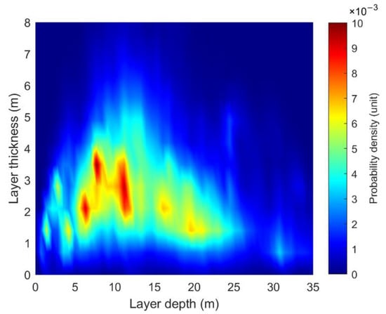The joint probability distribution of layer depth and thickness is shown in Figure 7. The depth and thickness of the thin layer in the northern Gulf of Mexico showed a normal distribution, respectively. The thickness varies from 1 m to 6 m, but is mainly concentrated within 4 m, and the depth is mainly distributed in 10–15 m. Ryan et al. detected thin layers in areas of Monterey Bay where the depth was less than 500 m in summer. Monterey Bay is the largest open bay on the west coast of the United States and is located in the central California Current System with abundant seasonal wind-driven upwelling, which is similar to the Gulf of Mexico. The vertical thickness of the thin layers ranged from 1–5 m and the depth from 12–33 m []. Johnston et al. obtained similar results in a larger area of Monterey Bay [].