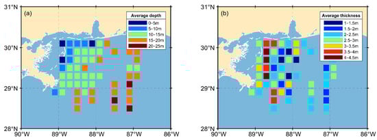 The detection area was divided into patches according to latitude and longitude, and the average layer depth and thickness within each patch were calculated, as shown in Figure 8. From nearshore to offshore, the color patches of layer depth change from blue to red gradually. Instead, the pattern of change in thickness is the reverse. The depth of the thin layer was shallower in the nearshore area, with an average depth of 11.5 ± 4.8 m, while the average depth in the deep area was 16.9 ± 7.75 m. The average thickness of the thin layer in the shallow water area is 3.5 ± 1.7 m, while in the deep area it is 3.0 ± 1.6 m.