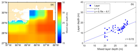 Mixed layer depth and thin layer depth. (a) Daily mean mixed layer depth in the Gulf of Mexico on 29 September; (b) Statistical analysis of layer depth and mixed layer depth.