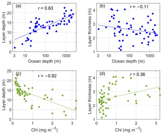 Statistical analysis of (a) layer depth vs. ocean depth; (b) layer thickness vs. ocean depth; (c) layer depth vs. chlorophyll concentration; (d) layer thickness vs. chlorophyll concentration.