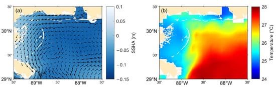High nutrient concentrations at the sea surface are also associated with eddies and upwelling. The water velocity in the eddy’s core is low, while the surrounding water velocity is high. The water pressure in the center of the eddy is greater than the surrounding area, so the water spreads around, causing a rise in nutrient salts at the bottom of the ocean in that area, leading to an increased possibility of thin layers forming around it. According to the sea surface height anomaly (SSHA), at 29°N30′, 88°W30′, there exists a central region of lower sea surface height where eddies may exist. In the research of He’s team [], the sea surface height anomaly data in the South China Sea had been used to determine the eddies. Combined with the water flow velocity data, the presence of eddies can be confirmed, and there is another eddy with the same rotation direction on the east, as shown in Figure 11a. Upwelling caused by eddies carries nutrients to the subsurface, and this vertical exchange is more likely to form in regions with lower seawater surface temperatures in Figure 11b. Nutrients rise more easily to the surface where the sea is shallow. The combination of currents and topography contributed to the formation of the thin layer in this region.