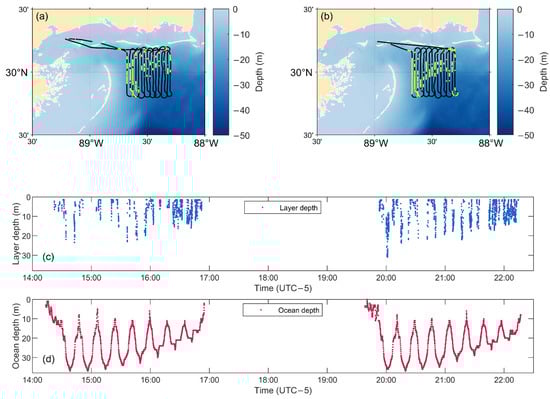 The maps of layer distribution and layer depth variation with time in the two detections on 4 October. (a) Layer distribution of the first detection. The black line is the flight route. The yellow lines are the positions where thin layers were detected; (b) Layer distribution of the second detection. The black line is the flight route. The yellow lines are the positions where thin layers were detected; (c) Layer depth variation during both detections; (d) Ocean depth variation during both detections.