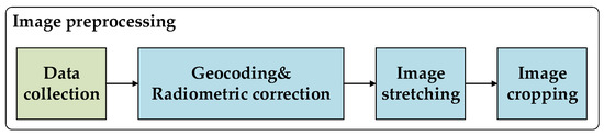 The geocoding employs a correction model based on the rational polynomial coefficient (RPC), which can be obtained from the RPC file. The L2 SAR product can be obtained after geocoding and geometric correction using the RPC correction batch program. The image is then stretched between 0 and 255 by many methods, such as a 2% linear stretch. The contrast enhancement is achieved by linear stretching [35,37], which can improve the intensity of building areas with weak dihedral angle scattering [51]. In this way, it can improve the accuracy of BA extraction to a certain extent. On the basis of the L2 SAR product, the image is cropped into sub-image sets for smaller size. A 50% overlap rate was used to obtain these patches. Likewise, after the steps shown in Figure 2, the Sentinel-1 data are processed into the format required by the model.