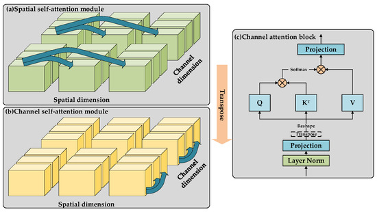 Architecture of the dual-attention encoders: (a) Spatial self-attention module, (b) channel self-attention module, and (c) channel attention block.