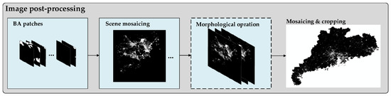 Figure 5 shows the flow chart of the post-processing. The mosaic module was designed for stitching the result patches and restoring the original geographic range. For the size problem of SAR images, the sliding window method was adopted for block prediction. In the process of image cropping, a certain continuous ground surface might be cropped into different patches. Objects located at the edge are easily misclassified in this condition. To avoid the influence of the edge errors, the result at the center of the sliding window is preserved. Assuming that the size of the sliding window is (W, H), set the sliding window step size to (k × W, k × H), and pad the image with 0 values accordingly. Parameter k is a scaling factor that varies from 0 to 1. For result labels, the results are kept in the range ((1 − k) W/2:(1 + k) W/2, (1 − k) H/2:(1 + k) H/2). According to the corresponding coordinates of the slice, the predicted result of the whole scene image is obtained by restoring the position. To remove the noise and smooth the boundary, some morphological methods are applied to deal with the whole-scene BAs, including the opening operation and closing operation. In terms of large-area mapping, the relevant functions of the ArcPy (a library that adds additional functions to Python) module are used in our program. BA results are collected and spliced by geographic extent. The shapefiles of the provinces are used to clip the above results to obtain more accurate products. During this process, the overlap area setting is maximized to retain more information.