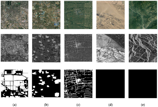 Google Earth images, SAR images, and labels of the dataset: (a) Urban areas, (b) rural areas, (c) strip-shaped buildings, and (d,e) negative samples. White and black on the labels represent built-up and non-built-up areas, respectively.