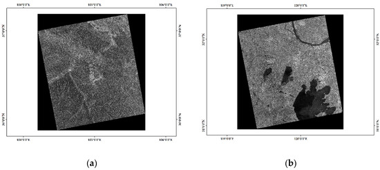 For accuracy assessment in mountainous and plain areas, two SAR images were chosen in the experiment, as shown in Figure 7. Sentinel-1 data in Jiangsu province were selected for the generalization ability test. A total of 90 GF-3 data in Gansu and 8 Sentinel-1 data were used for large-scale mapping as shown in Table 3.