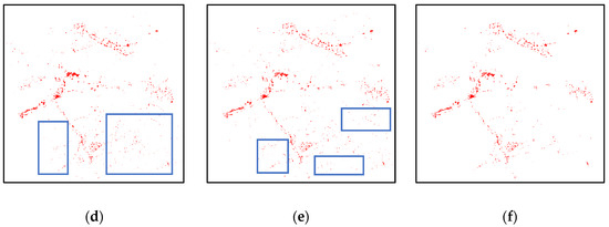 The BA results in T1: (a) Google Earth image, (b) ground truth, and (c–f) results based on UNet, PSPNet, SegFormer, and the proposed model. The blue box marks the false alarms.