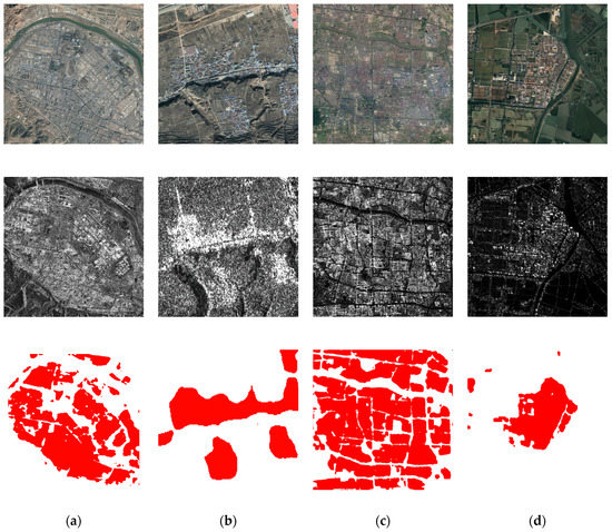 Google Earth images, SAR images, and BAs of the two provinces: (a) Urban area in Gansu, (b) village area in Gansu, (c) urban area in Jiangsu, and (d) village area in Jiangsu.