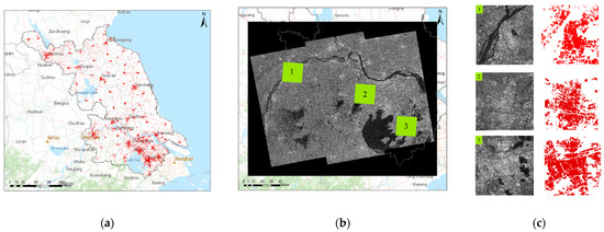 The public dataset SAR BUilding Dataset (SARBuD) for BA applications in deep learning (https://github.com/CAESAR-Radi/SARBuD, accessed on 20 May 2022) was used as the basic dataset. SARBuD covers every province in China using 10 m GF-3 SAR images. In addition, five scenes of GF-3 images were used to supplement the dataset, details are shown in Table 2.