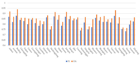 A total of 200 validation patches were randomly selected in each province to evaluate the accuracy. The OA and F1 score of each province or region are illustrated in Figure 14. The OA of the results ranged from 0.76 to 0.93, and the F1 score of the results ranged from 0.73 to 0.88. The highest OA and F1-Score values were in Beijing, and the lowest in Xizang. From the results, the OA in the plain area was higher than other regions due to dense urban distribution.