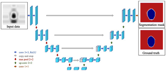 Figure 4 illustrates the U-Net architecture. The entire network presents a symmetrical “U” shape. It consists of contracting and expansive paths, which correspond to the left and right sides of the figure, respectively.