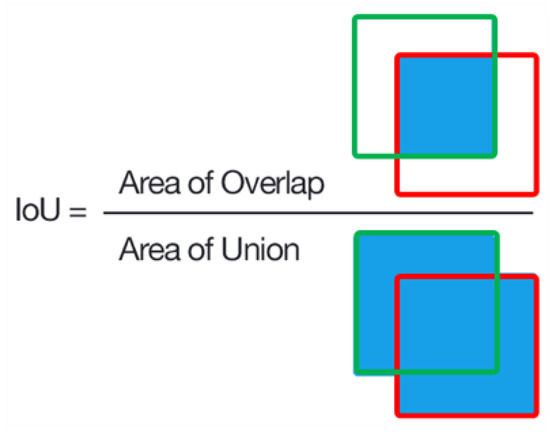 IoU is the ratio of overlap to union of the ground truth (green box) and the segmentation result (red box).