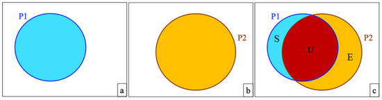 Changes in the target are shown by overlapping the masks. (a) Segmentation mask P1; (b) segmentation mask P2; (c) results of comparison by overlapping P1 and P2. The blue mask marked with “S” indicates the part in P1 which is not seen at the same position in P2; the yellow mask marked with “E” indicates the part that does not appear in P1 but is seen in P2.