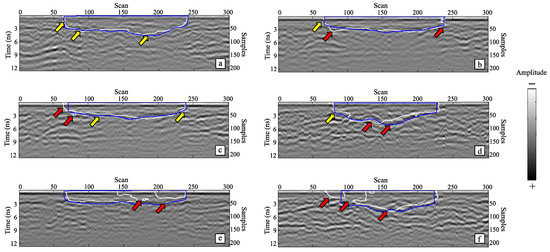 Segmentation results of time-lapse data of the P50 profiles. (a–n) are the P50 profiles from 20 May to 26 September. The date and subplot number correspond to those in Table A1. The segmentation was not affected by interferences from multiple reflections (red arrow in (a–g)) or a dead signal (red arrow in (j)). In a few cases, the segmentation slightly deviated from an ideal performance (red arrow in (l)).