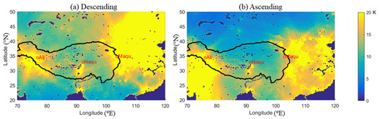 To validate the accuracy of satellite-based L-band observations in the TP, the SMAP and SMOS observations are compared to the in situ ELBARA-III observations in the Maqu SM observation network. Figure 1 show the comparison of SMAP, SMOS, and ELBARA-III observations from August 2016 to July 2017 for the evening overpass. It can be found that the is significantly correlated with soil dryness and wetness and freeze–thaw transitions. For example, the increases during the soil freezing period (November to February) and then decreases as the unfrozen (liquid) soil water increases with soil thawing. As shown in the figure, the variations of SMOS and SMAP observations are generally consistent with the ELBARA-III measured trends, whereby the SMAP observations are more consistent with the ELBARA-III observations. The correlation coefficients between SMAP and ELBARA-III observations are greater than 0.87, and the RMSE and ubRMSE for the observations are smaller than these of . Good performance of SMAP observations was also reported in ref. [39,45]. Compared to the performance of SMAP data, the SMOS data show degraded accuracy and larger fluctuating, which may be related to the influence of RFI and the stability of the radiometer [36]. To further investigate the impact of RFI on the SMOS observation, Figure 2 provide the root-mean-square error (RMSE) computed between the SMOS observations and simulations produced by the CMEM model for both descending and ascending overpasses performed by the authors. From the figure, it can be found that the RMSE for the SMOS observation in the TP is as high as 10–20 K, indicating that the SMOS satellite may be seriously affected by RFI in the TP. A similar finding was also reported by Dente et al. [36].