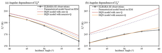 Angular dependence of ELBARA-III observations and corresponding simulations produced by the h-Q-N model with/without a zero Q value as well as the parameterized model developed by Shi et al. [57] based on the IEM simulations. The figure is modified from Wu and Zheng [57].