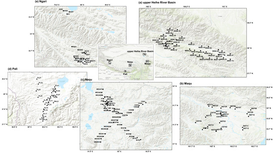 Locations of (a) upper Heihe River Basin, (b) Maqu, (c) Naqu, (d) Pali, and (e) Ngari SM observations networks and corresponding deployed SM observation stations on the TP.