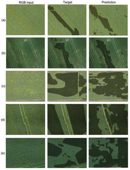 Despite IoU and F1-scores that were generally low, precision and recall give us some more insight on the model behaviour. Particularly, recall is much higher than precision which means that the model found the majority of the weed label pixels, but generally overpredicted the weed. However, this is not a systematic overprediction otherwise the accuracy of the model would be much lower than the observed values. To further investigate this, Figure 2 shows some prediction examples against the related weed labels for some fields, with weed visible as the light green and yellow plants in the original RGB images. This shows that the model in some cases overpredicted around found patches, but also that patches and individual plants missed during labelling are actually correctly identified by the model. Furthermore, some smaller areas not actually containing weed that were labelled as weed are not included in the model prediction (e.g., examples d and e). Obviously, these would be considered as incorrect predictions, further penalising performance. Finally, in a few instances where weed patches are adjacent to field tram-lines, the model predictions extend onto the tram-lines (e.g., Figure 2 examples d and e). However this is not a systematic error (e.g., this is not happening for all the tram-lines in examples d and e and not happening at all for examples b and c).
