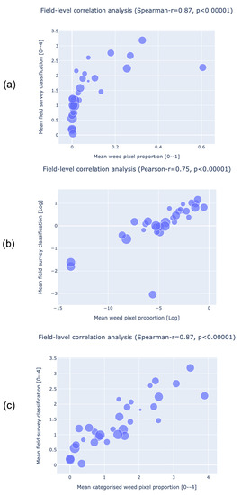 Field level correlation analysis (marker size indicates field size): (a) correlation analysis between field-level mean deep-learning weed pixel proportion in each quadrat and the field-level mean field survey data classification; (b) correlation analysis between the log-transformed field-level mean deep learning-derived weed pixel proportion in each quadrat and the log-trasformed field-level mean field survey data classification; (c) correlation analysis between field-level mean deep learning-derived weed pixel proportion derived classification in each quadrat and the field-level mean field survey data classification.