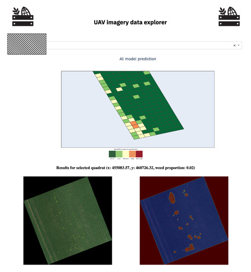 To make the model usable, we created a lightweight Docker container that only needs the path to newly collected data to predict on (e.g., field RGB image collected with UAV). For example, this took 22 min to process the RGB of a new field of size 2.5 hectares, on a Power8 system with a single GPU, 20 cores and 64 Gb of RAM. The docker container could be made fully operational via a simple API or just used locally (e.g., it works with and without Graphical Processing Units) by analysts and agronomists. Once categorised, the output is then accessible via a simple dashboard, e.g., Figure 6, providing an easily understandable overall view of the weed abundance in the field. This map is also clickable, giving the user the chance to explore the results to gain confidence in the model predictions. Furthermore, the data used to build this map, which contain geolocated weed abundance, could be easily exported and made available to on-farm machinery to support targeted herbicide applications.