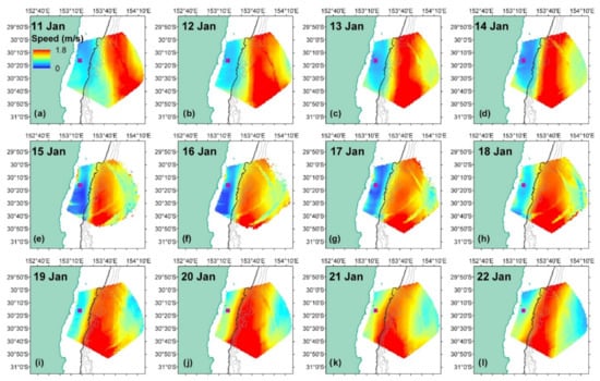 Daily averaged surface current speed from 11–22 January 2016 (a–l) observed by HF radar. The line and point symbols are as in Figure 1. The black line denotes the shelf break.