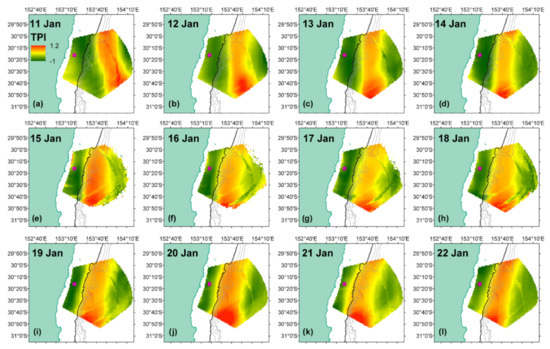 The daily averaged surface current speed of the study area from 11–22 January 2016 is shown in Figure 2. The EAC is clearly shown as a prominent oceanographic feature with a higher current speed (>1 m/s) than its surrounding waters. The corresponding TPI surfaces of the daily surface current speed and the maps of the EAC’s speed signatures are shown in Figure 3 and Figure 4, respectively. Overall, the EAC exhibited rapid shoreward intrusion, often with a considerable movement occurring at a daily interval during the event.