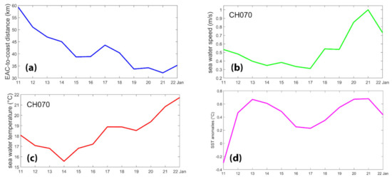 The EAC’s speed signature maps have enabled direct measurement of the EAC-to-coast distance during the event (Figure 4 and Figure 5a). On 11 January 2016, the EAC was at a relatively large distance (59.3 km) from the coast. From the 11th to 15th, the EAC moved swiftly towards the coast with a daily advance of ~5 km, being ~39 km off the coast on the 15th and the 16th. On the 17th, the EAC slightly retreated offshore (~4 km; distance to coast: 43.6 km). After that we observed another abrupt and significant intrusion towards the coast during the next two days until the 19th when the EAC was firmly aganist the shelf break, with the distance reduced to 33.7 km. From the 19th to the 22nd, the EAC remained very close to the shore and the minimum EAC-to-coast distance (32.2 km) during this event was observed on 21 January (Figure 4k and Figure 5a). Note that on the 21st, the EAC was ~15 km from the CH070 mooring (Figure 4k).
