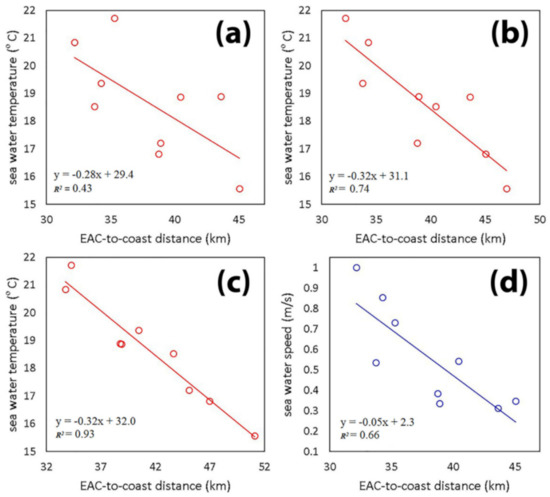 Linear relationship between the EAC-to-coast distance and bottom ocean temperature (a) no lag, (b) 1-day lag, (c) 2-day lag, and (d) surface current speed (no lag). N = 9 (14–22 January).