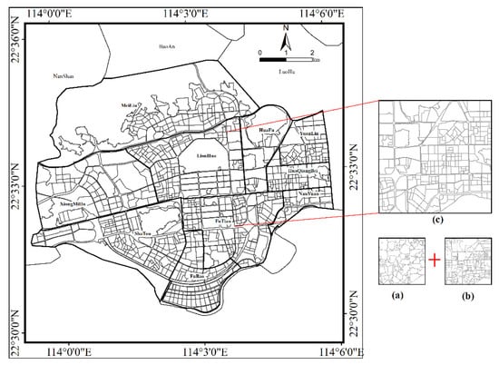 Spatial unit for identifying the urban functional areas: (a) feature boundaries; (b) road network; (c) spatial unit.