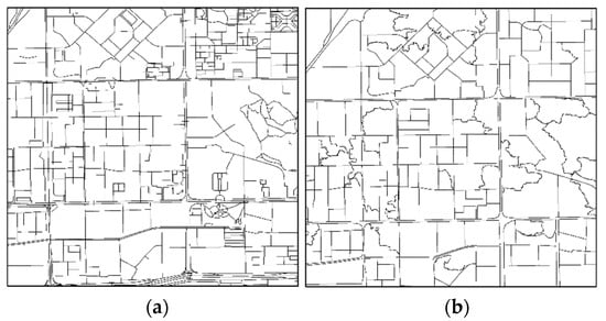 OSM datasets were downloaded from OpenStreetMap [31] in September 2020. The original road types of OSM include Motorway, Primary Road, Secondary Road, Tertiary Road, Trunk Road, Residential Road, and Unclassified Road (Figure 3a). We first eliminated useless road lines to obtain the main road-network outline containing only road edges. Then, the topology was edited, including the removal of broken lines, pedestrian bridges, ramps, and other miscellaneous lines, and the completion of incomplete roads based on remote-sensing images. After the above two steps, the final road network after processing was obtained (Figure 3b).