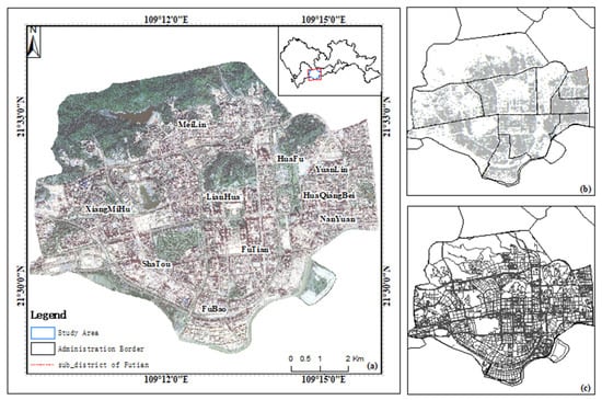 (a) High-resolution images from GaoFen-1 (GF-1) covering Futian District; (b) location of Shenzhen in China; (c) POIs of Futian District.