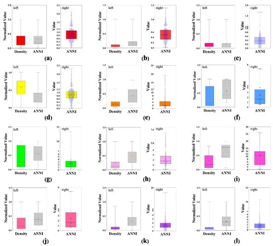 To gain insight into the spatial distribution of the POIs corresponding to each type of functional area in the study area, we calculated the magnitude of the ANNI and drew a box plot of the normalized ANNI and normalized density index of the POIs for all spatial units in the study area, shown in Figure 6. Based on the combination of the ANNI and density index, the spatial characteristics of all POIs were divided into three categories. The first category had a large number of points, with a low normalized density index and normalized ANNI that were close, such as the POIs of Business (Figure 6a) and Commercial (Figure 6b) Facilities and Administration Office (Figure 6c), the ANNIs of which are 0.86, 0.51, and 0.40, respectively. In the Futian central business district, there are a large number of companies, such as investment and insurance companies, as well as shopping, entertainment, and leisure facilities, and the distribution of Business POIs in these areas is dense, and the average-nearest-neighbor index is low. Commercial POIs, such as supermarkets and restaurants, are distributed along the streets, and their average-nearest-neighbor indexes are generally less than 1 because many Commercial Facilities are widely located around residential and business areas. For the second category, the normalized density was much higher than the normalized ANNI. Residential was such an example (Figure 6d). There were 638 spatial units containing Residential POIs in Futian District, and the ANNI for the Residential POIs was 0.87, indicating that Residential elements are mainly clustered in space, even though they are widely distributed. The third category had a small number of POIs in the whole study area, and a low density of POIs within the spatial unit, but a large ANNI value; for example, Industry (Figure 6e), Street and Transportation (Figure 6f), and Green Space (Figure 6g). The ANNI values of the above three types of POIs are 3.67, 3.83, and 2.66, respectively, which means that these POIs are more scattered. The Administration and Public Services POIs contain six subcategories. Except for the Administration Office, with a lower ANNI of 0.4 (Figure 6c), the five other categories, including Education, Medical Health, Sports Facilities, Cultural Media, and Research, had high ANNIs, with values of 2.15 (Figure 6h), 10.45 (Figure 6i), 2.39 (Figure 6j), 1.59 (Figure 6k), and 1.78 (Figure 6l), respectively.