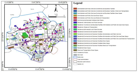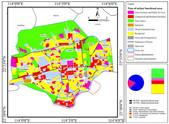 Among the single-function areas, the urban Green Space is the largest and most dominant functional-area type in Futian District, accounting for 38.48% of the study area. This is followed by Residential Areas (37.39%), Commercial and Business Facilities (13.65%), and Administrative and Public Services (8.52%). Large areas of urban Green Space exhibit the achievements of Shenzhen government’s effort in improving people’s well-being. Moreover, as the financial center of Shenzhen, Futian District has gathered a large number of domestic and foreign financial institutions and companies, and so the area of the Commercial and Business-function area is relatively high. With regard to the pattern of single-function areas, the residential area is distributed in all areas of Futian District, forming a circular-distribution pattern, with the central area of Futian District as the core. Commercial and Business Facilities includes two categories of land use, for business offices and commercial facilities, concentrated in the Futian Free Trade Zone in the south, the central area of Futian District, the Huaqiang Bei area in the east, and the Chegongmiao area in the west. The Administration and Public Services category is mainly distributed in the areas of Huaqiang North, Central District, and Li Zhi Park. The industrial land in Futian District is dominated by factories for garments, electronics, hardware production, and ceramics, accounting for 1% of the area. The number of industrial-land units is relatively small and mainly mixed with other functions, such as residential, commercial, and business facilities. Street and Transportation units are mainly occupied by bus stations and gas stations, accounting for 0.51% of the study area, and are mainly located in the western, central, and eastern parts of Futian District. Green Spaces are mainly located in the north of Futian District, including parks of different sizes.