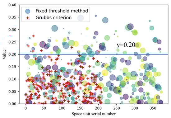 If the of one type of POI was significantly higher than those of other POI types, then we considered the unit a single-function spatial unit. Otherwise, the spatial unit was regarded as a mixed-function type. Thus, how to evaluate the relative importance and assign the main functional attributes of the spatial unit is critical. In this paper, the Grubbs criterion is employed [28]: