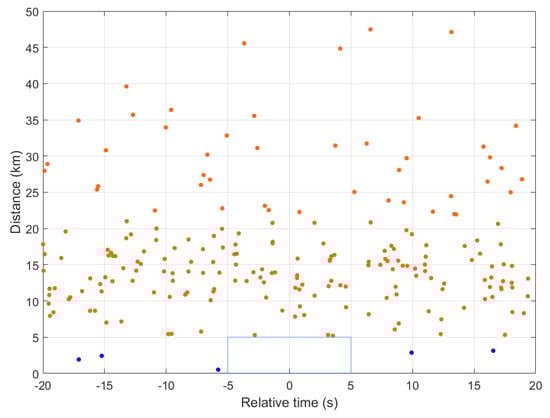 Figure 7 shows the scattered initiation points of the NLFs at a distance from the flash-triggered position and time from the TLF. In terms of distance, 5 km was still a relatively evident demarcation; in the statistical time range of 20 s before and after the TLFs, the events corresponding to the NLFs initiated within and beyond 5 km were the least and most in number, respectively. For the 68 TLFs, there was no corresponding NLF initiated within a 5 km radius from the flash-triggered position, and within 5 s before and after their occurrence. At 10 and 20 s before the TLFs, there were one and three events in which the initiations of NLFs were located within a 5 km radius of the flash-triggered position. In the 20 s after the TLF, there was one event in which one TLF corresponded to two NLFs initiated within 5 km distance of the flash-triggered position.