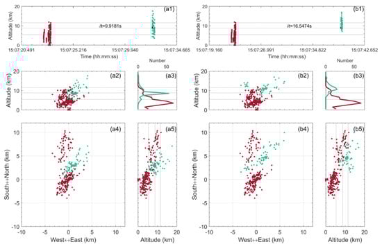Figure 8(b4)), but the NLF sources were generally higher than the TLF sources, with the NLF sources within a 2 km radius of the flash-triggered position having a peak height of 9 km, while the TLF turning its channel direction from upward to horizontal at approximately 5 km (