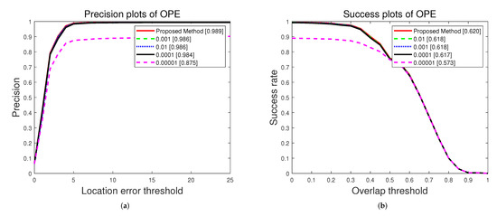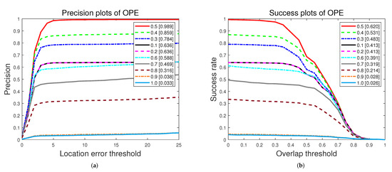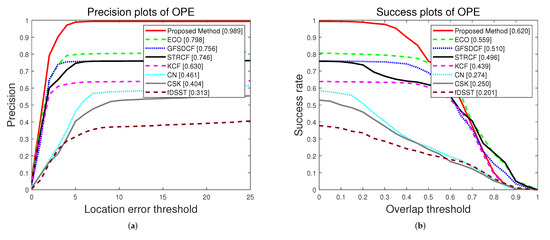 In this paper, two commonly recognized metrics [33] are used to quantitatively analyze the object tracking results, namely, the tracking precision score and the tracking success score. In addition, FPS represents the number of frames that the tracker can complete processing per second, which can be used to evaluate the tracking speed of the tracker.