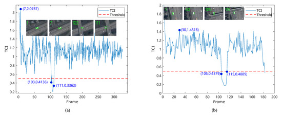 As mentioned above, we judge whether the object is occluded by observing the TCI fluctuation. Therefore, the selection of threshold has an important impact on whether the tracker can accurately judge the tracking state. We plot the TCI of all video sequences, as shown in Figure 5.