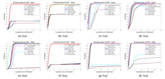 The tracking precision score is defined as the ratio of the number of frames whose center location error (CLE) is less than a certain threshold to the total number of frames. The calculation formula of the center position error is:
